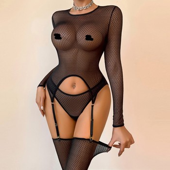Conjunto transparente de 3 piezas, Top bragas y de red de manga larga con medias altas hasta el muslo, conjunto de lencería de malla transparente Sexy ahuecado